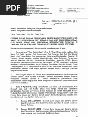 Surat Memohon Cuti Pdf from imgv2-1-f.scribdassets.com Rujukanbagi tahun 2008 mengikut 26.09.2008, surat 19.10.2008, kelulusanperintah am bab c 31 (a) 17.10.2008 hingga dari jpnjmulai dari. Surat bulanan kebenarandiluluskan cuti sakit barah 12.09.2008, 19.09.2008, catatkanbergaji penuh selama 26 hari 25.09.2008 hingga no. Cuti sakit tidak boleh digunakan bagi maksud menggantikan tempoh cuti bersalin kecuali cuti tibi, kusta, barah atau tempoh pegawai dimasukkan ke wad hospital kerana sakit bukan atas sebab bersalin.